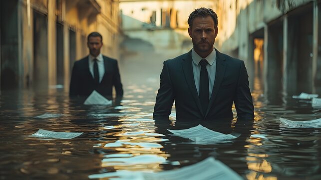 Businessmen in suits wading through flooded urban streets with financial papers adrift facing the impacts of climate change on their ope ns