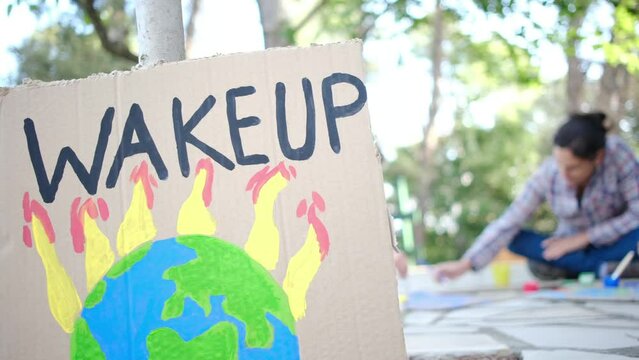 A mother and her two children prepare colorful protest signs against climate change and pollution using paintbrushes