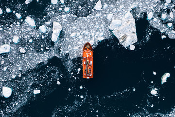 Minimalistic aerial view of an orange icebreaker in sea ice