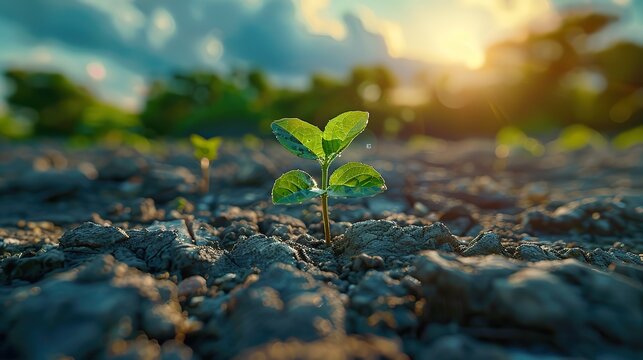 A parched landscape with a single green plant struggling to thrive conceptual illustration of the impacts of climate change on biodiversity and ecosystems.