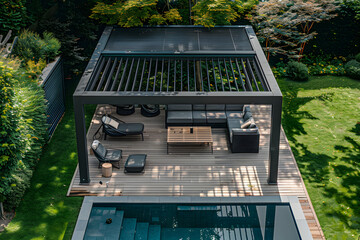 Modern black bio climatic pergola with top view on an outdoor patio. Teak wood flooring, a pool, and lounge chairs. green grass and trees in a garden, generative AI