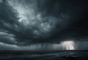 A dramatic stormy sky with intense lightning bolts illuminating an empty, wet road, creating a sense of mystery and power in nature.