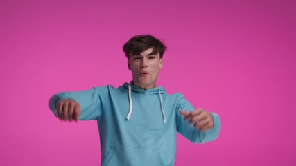 excited casual man in blue sweater moving his arms while pretending to explode at the climax