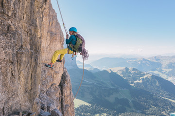 Climber scaling rocky cliff promoting enthusiastic adventure club