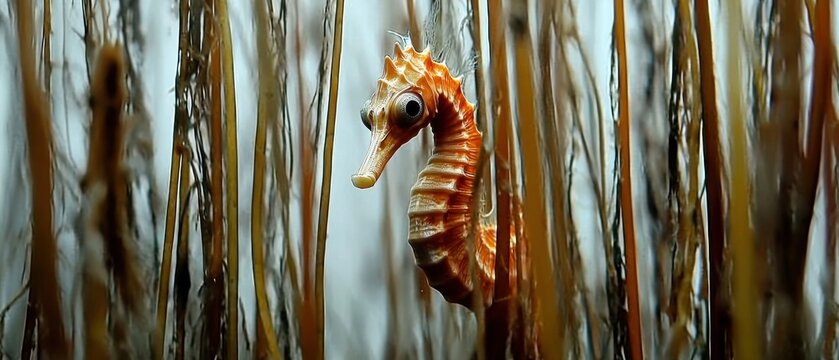 Unique seahorse clinging to seaweed in underwater habitat marine life close-up view
