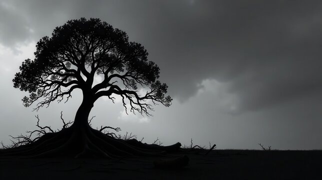 A solitary, ancient tree stands silhouetted against a brooding, overcast sky, its exposed roots clinging to the barren earth