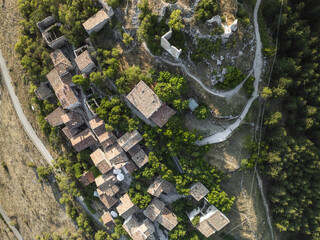 Aerial view of ancient stone buildings clinging to a hilltop, kissed by sunlight, Rocca Calascio, Abruzzo, Italy.