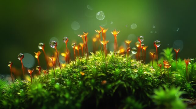 Extreme macro photography of emerald forest moss, intricate star-shaped structures and tiny filaments captured in extraordinary detail, glistening morning dew droplets clinging to velvet-like