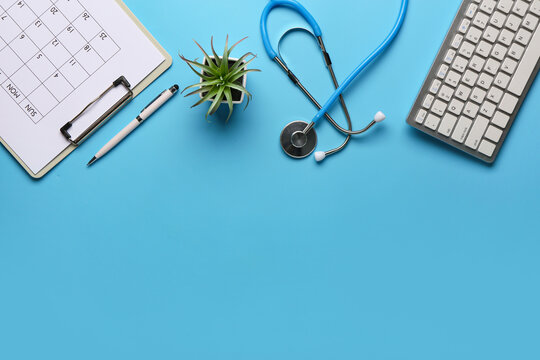 Modern computer keyboard, houseplant, clipboard and stethoscope on blue background