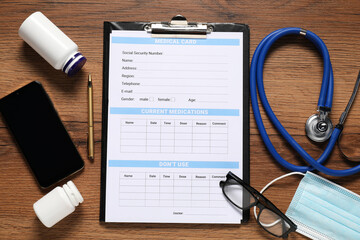Flat lay composition with medical card form, smartphone, pills and stethoscope on wooden table