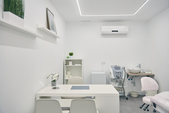 A modern empty dental clinic interior with bright overhead light and dental chairs with equipment