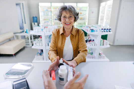 Senior woman giving various medications to pharmacist, aged customer buying medicine in the pharmacy drugstore, standing at counter
