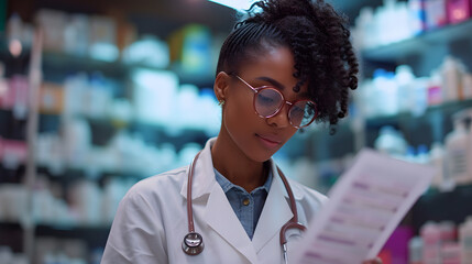 Pharmacist with medicine, in a futuristic pharmacy with holographic prescriptions, bright lighting, high detail, photo-realistic