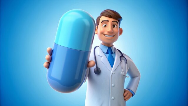 A cheerful cartoon character, either a doctor or pharmacist, holds a giant blue pill, enthusiastically endorsing it as