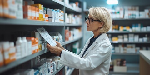 A focused pharmacist in a white lab coat checking medication packages on a tidy pharmacy shelf, ensuring accuracy and care.