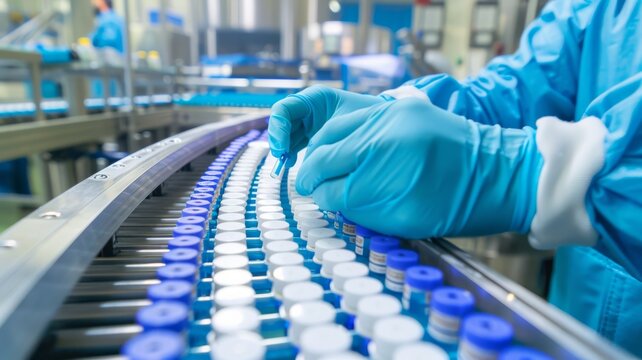 Pharmacist scientist with sanitary gloves examining medical vials on production line conveyor belt in pharmaceutical healthcare factory manufacturing prescription drugs