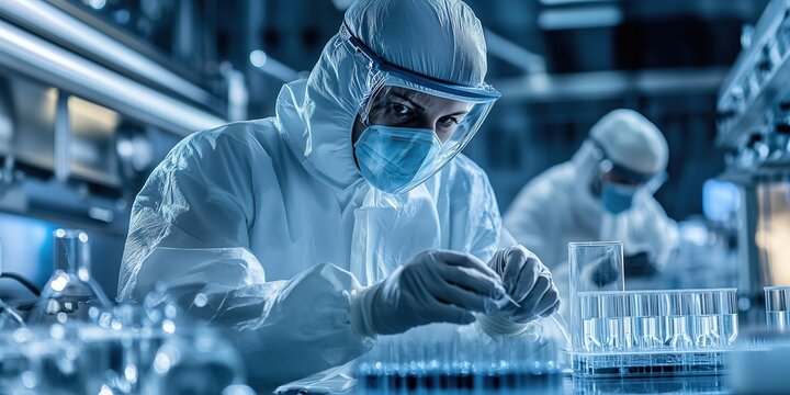 A scientist in a lab coat uses laboratory glassware and various liquids, demonstrating scientific experimentation and research within a modern laboratory.