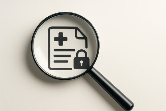 Magnifying glass focuses on medical healthcare document with lock symbol representing privacy security and protection of sensitive patient information in clinical setting