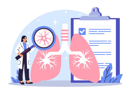 Female doctor analyzing human lungs with magnifying glass, cartoon style, on a clinical background with clipboard. Concept of lung health and diagnosis. Vector illustration