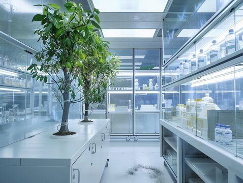 Microscope and test tubes in a laboratory setting, surrounded by crystalline structures, blue tone background