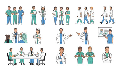 Diverse Medical Professionals Vector Illustration Set Featuring Doctors and Nurses in Various Clinical Poses, Consultations, Meetings, and Healthcare Scenarios.