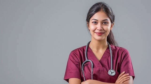 Confident smart young female Sri Lankan doctor in maroon scrubs and stethoscope on grey background
