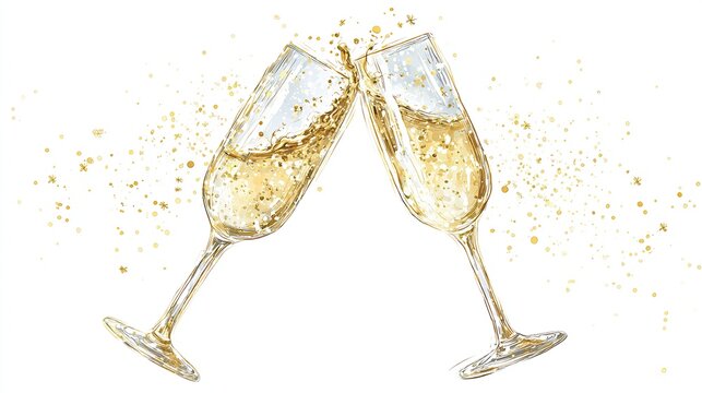 Two champagne flutes clinking, sparkling, and splashing with golden droplets against a white background