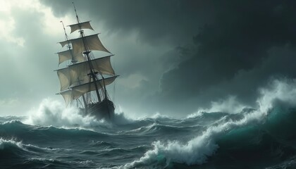 Majestic tall ship navigates stormy sea, battling high waves under dark, cloudy skies. Vessel shows resilience and adventure during a turbulent nautical voyage. Dramatic, powerful maritime scene.