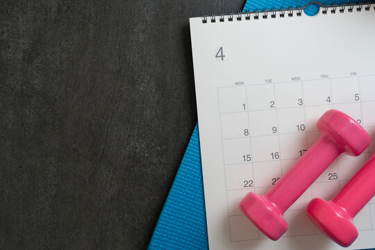 Time for exercising equipment dumbbell and calendar with black background, sport and healthy concept