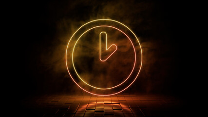 Orange and yellow neon light clock icon. Vibrant colored technology symbol, isolated on a black background. 3D Render