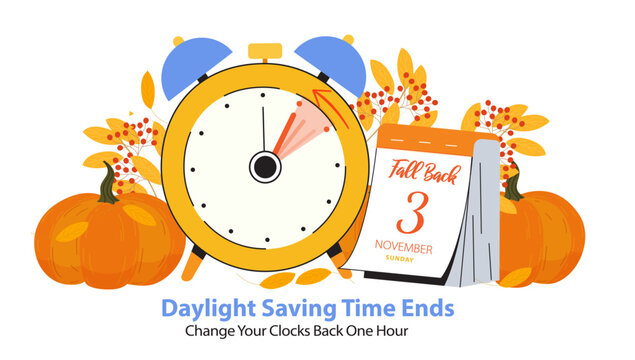 Fall Back or Daylight Saving Time Ends concept banner. Schedule with Alarm Clock turning back on hour and calendar showing date - 3 November, Sunday 2024. DST information poster with pumpkins