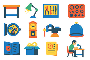 Clockmaking Workshop Icons. Flat vector icons of clockmaking workshops: wooden workbench, clockmaker lamp, organized tool rack,