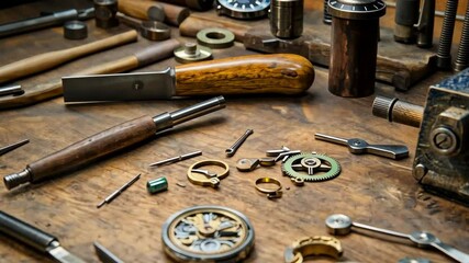 Exploration of vintage tools and watch components on a wooden workbench in a crafting workshop