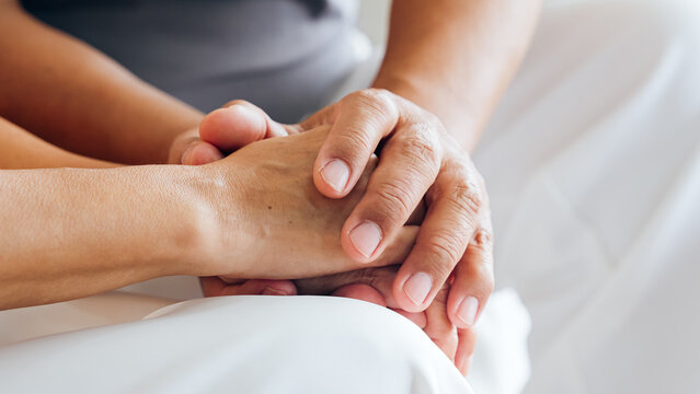 Close up view of caring elderly grandma wife holding hand supporting senior grandpa husband give empathy care love, old married grandparents couple together