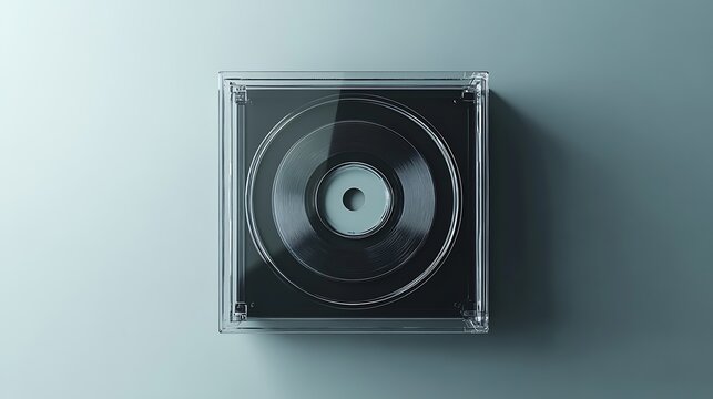 Top view reveals a transparent case enclosing an audio vinyl record on teal