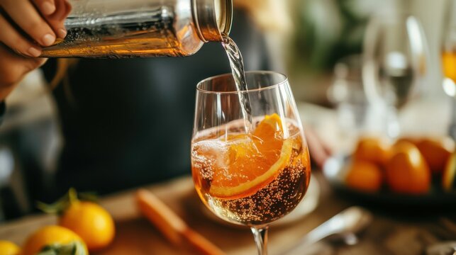 drinks and people concept - close up of woman pouring soda from tin can to wine glass and making orange cocktail at home kitchen