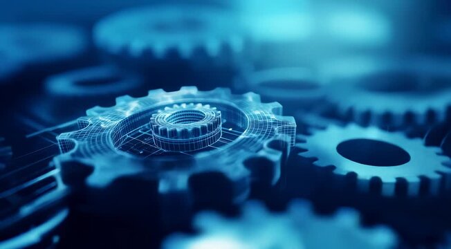 High-tech digital wireframe rendering of interconnected gears in a blue and black mechanical or engineering concept.