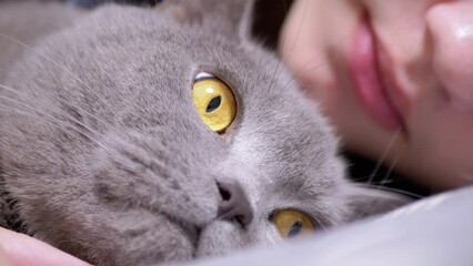Close up, Gray Fluffy British Cat Lies next to a Sleeping Child in the Bedroom. Portrait. Cat head. A cat with green eyes looking at the camera. Blurred background of a child. Texture. Rest. Bedtime.