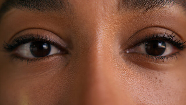 Close up dark eyes African American woman female face girl vision businesswoman eyesight sight see looking at camera makeup health medicine laser correction business ophthalmology cropped view city