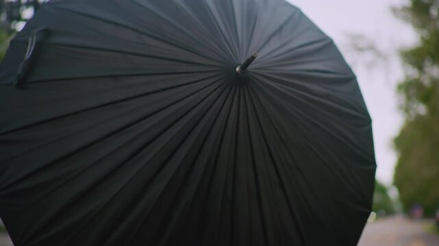 Collection of black umbrella silhouettes in various open and closed positions and a person sitting
