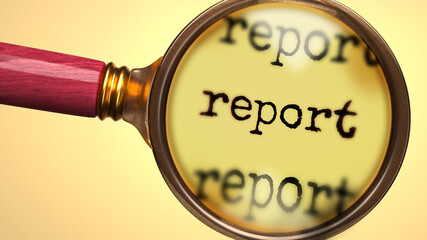 Examine and study report, showed as a magnify glass and word report to symbolize process of analyzing, exploring, learning and taking a closer look at report, 3d illustration