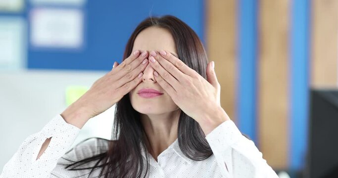 Young caucasian blonde woman closes her eyes covering them with hands isolated on gray background. Pain in the eyes, photophobia, painful sensitivity to bright light. Surprise, hiding. Ophthalmology
