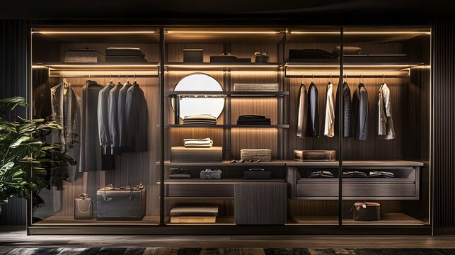 Modern walk-in closet with glass doors, wood shelves, and warm lighting.
