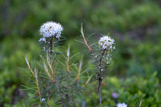 Closeup of Marsh Labrador Tea (rhododendron tomentosum) in swamp in summertime, Nuuksio, Espoo, Finland.