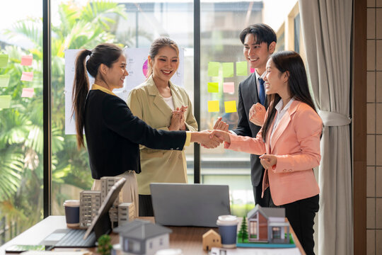 Two business professionals shaking hands after successfully closing a deal in the office, embodying trust and collaboration while celebrating a significant partnership achievement