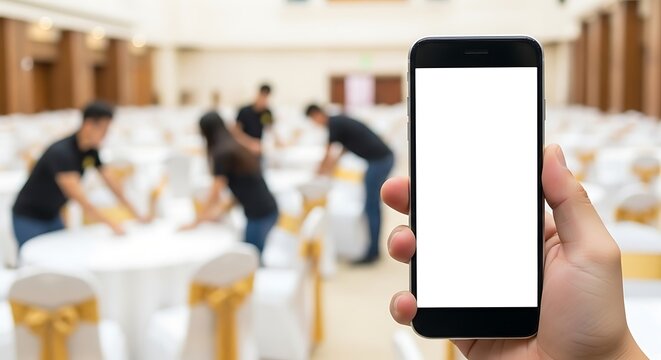 A person holding a smartphone with a blank screen, with event staff setting up tables.
