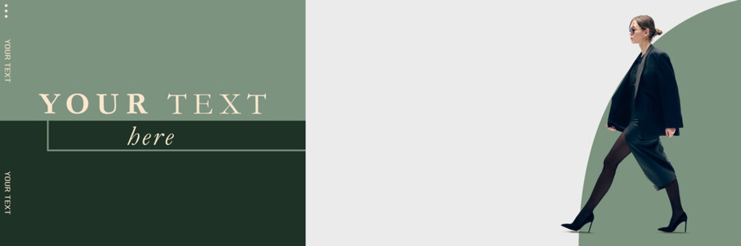 Stylish woman in black outfit with leather skirt walking confidently, set against green-themed background with text elements. Concept of female fashion, trends, style. Banner template, ads