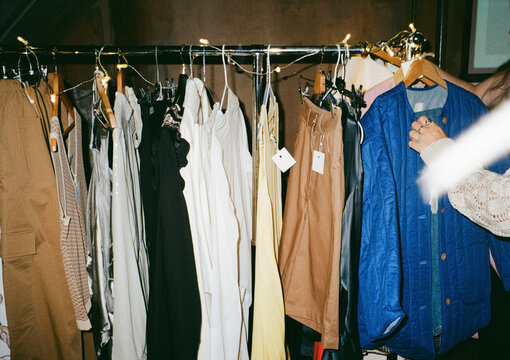 Second hand clothes on hangers for donation and reselling. Garage sale or economic shopping concept. Second life for your clothing. Selective focus