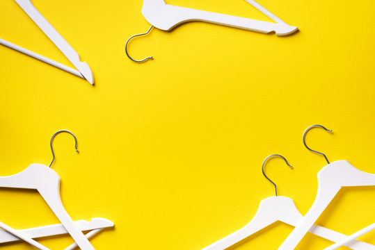 Top view of white clothes hangers on yellow background with copy space. Flat lay. Minimalism style. Creative layout. Fashion, store sale, shopping concept. Banner for feminine blog