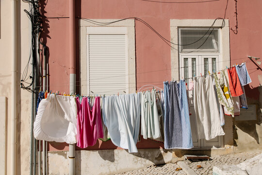 Clothesline with pins, one continuous line drawing. Laundry, clothespin doodle illustrations set